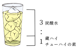 3. 大きめの氷たっふり、チューハイの素1:炭酸水3 (※濃い目が好きなら1:2)
